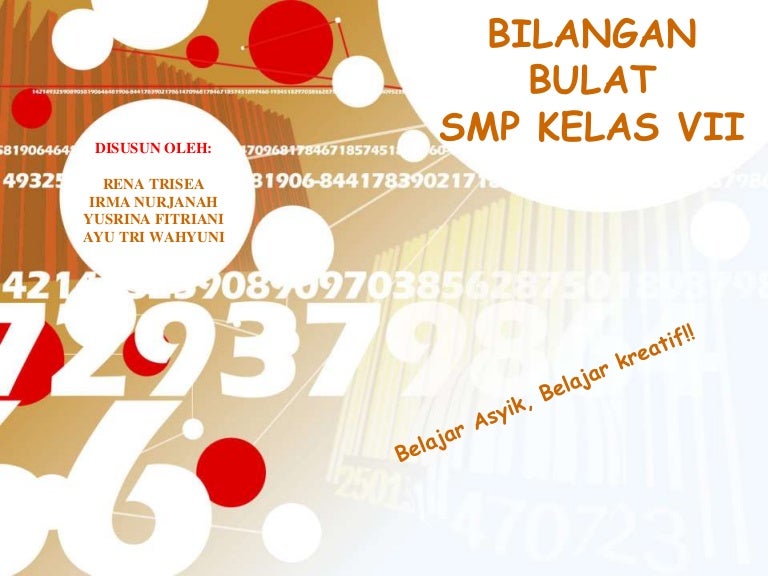 Matematika Kelas 7 Bilangan Bulat. Bilangan bulat sendiri merupakan himpunan bilangan yang termasuk didalamnya adalah bilangan cacah, bilangan asli, bilangan prima, bilangan komposit, bilangan nol. Bilangan Bulat Bab ini memuat materi mengenai operasi tambah, kurang, kali, bagi, dan pangkat pada bilangan bulat beserta sifat-sifatnya; cara menaksir hasil perkalian dan pembagian bilangan bulat; kuadrat dan pangkat tiga serta akar kuadrat dan akar.
