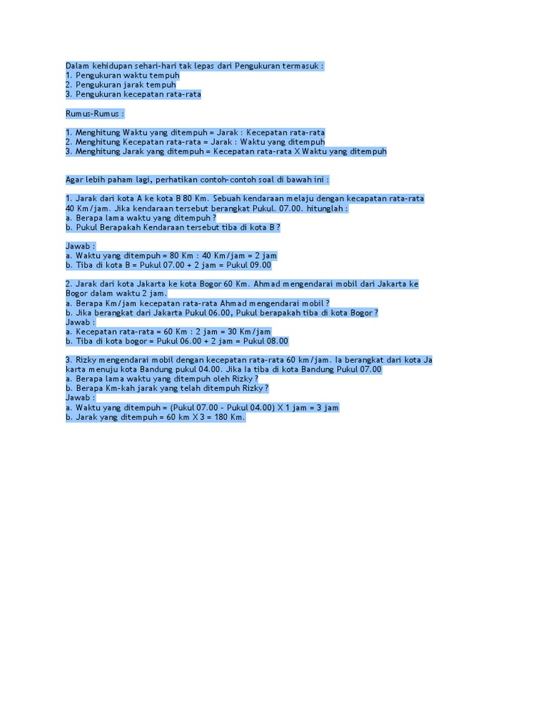 Contoh Soal Hubungan Antarsatuan Waktu, Panjang, dan Berat ... (Matthew Quinn) Materi ini mulai dikenalkan di SD kelas V. Saya akan membahas soal tentang kecepatan yang sering muncul di UN, dan biasanya dalam bentuk soal cerita. Dalam matematika dasar, kecepatan merupakan suatu besaran yang menyatakan jarak yang ditempuh suatu benda per satuan waktu tertentu.