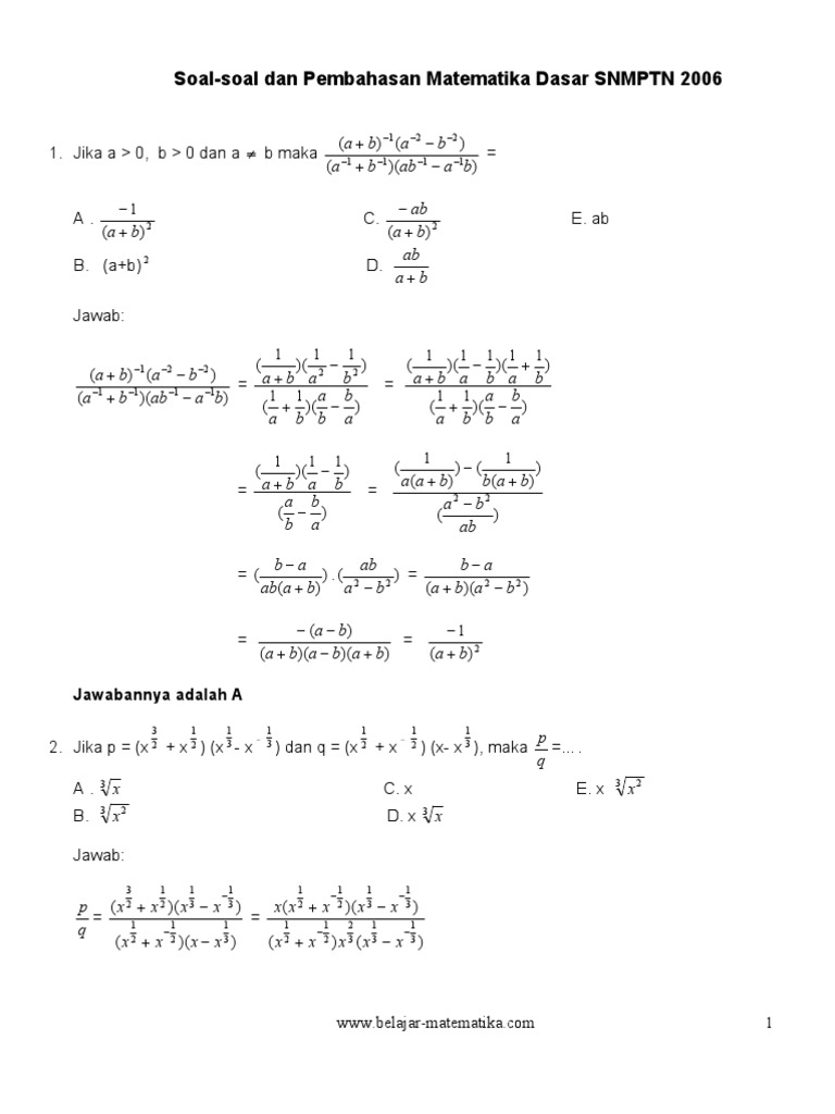 Soal-Soal Dan Pembahasan Matematika Dasar SNMPTN 2006